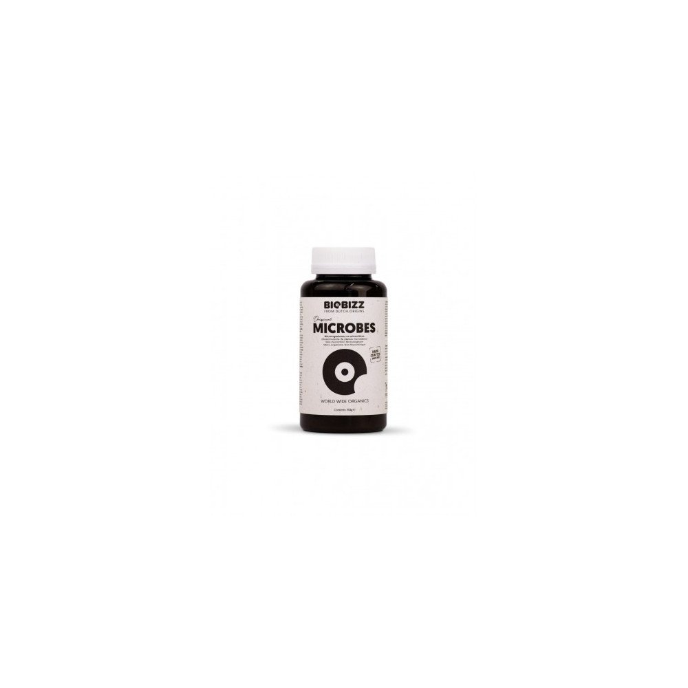 Microbes Original Biobizz de 150 gramos, esta formada por 4 tipos de bacterias (mejoran el proceso de nutrición, la promoción de hormonas, el crecimiento del tejido y la solubilización de nutrientes), enzimas (desbloquean las cadenas proteicas dads por los fertilizantes y tienen un efecto inmediato para catalizar los nuetrientes orgánicos) y los hongos Trichoderma (proporcionan un aumento de la salud, la producción y el volumen de nuestras plantas).